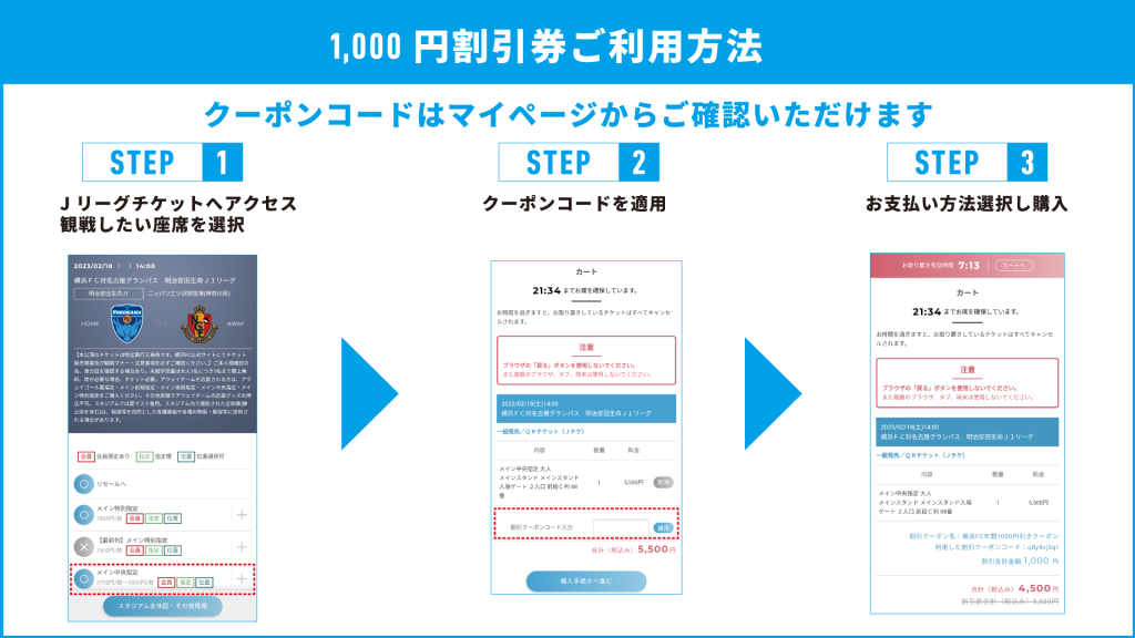 各種割引券のお申込はJリーグチケット通常ページでチケットを選択後に表示されるクーポンコード入力欄に、お客様のコードをご入力ください。